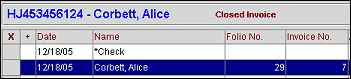 X. An X in this column indicates that the invoice has been selected to be closed. Click in the X column to select the invoice. Or you may select the invoice by highlighting it and pressing the spacebar. If you are choosing only one invoice to be closed, you may simply highlight the invoice without placing an X in this column.