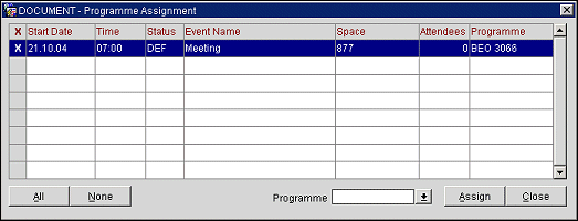 If none of the events for this business block have as yet been assigned to a programme, select the Assign button. The Event Programme Maintenance screen appears. Choose the programme and select the OK button.