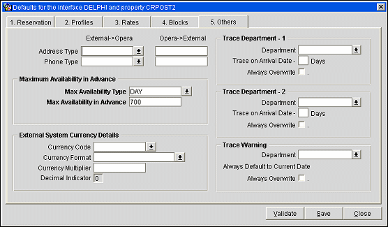 This default page is the other default page. The OPERA values can be chosen by selecting the button seen alongside the text entry field. A list of configured and valid OPERA values for this item displays. The external system values have to be inserted in a free- format style, but need to be valid for the external system to accept the record. Be aware of case sensitivity.