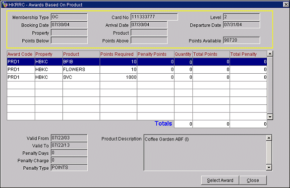 If you select Product as the basis to issue an award from the Query Awards screen and select the Availability button, the Awards Based on Product screen appears. At this screen, view the list of awards displayed based on the criteria you chose, including the arrival and departure dates. Highlight the award you want to grant and select the Select Award button.