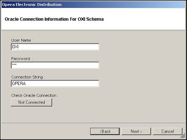 Note: When an existing OXI Schema password is changed, Oracle Data Centers can access the utility "mfPasswordUpdater.exe" in Opera/Tools/OXI/Utilities on the application server to update the password, instead of using the wizard.