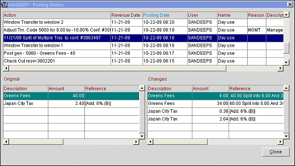 Highlight a transaction on the Posting History screen Action grid to display the details for that posting in the two lower grids.  The left grid (Original) shows the posting information before it was changed. The right grid (Changes) shows the current posting information or the posting information after it was changed, if appropriate.  For example, a deleted transaction would have an entry in the Original grid (the original posting), but not in the Changes grid (since no entry remains on the Billing screen for the deleted charge). A transaction that was split would have an entry in both the Original grid (the original unsplit posting) and the Changes grid (the amount split off from the original posting).
