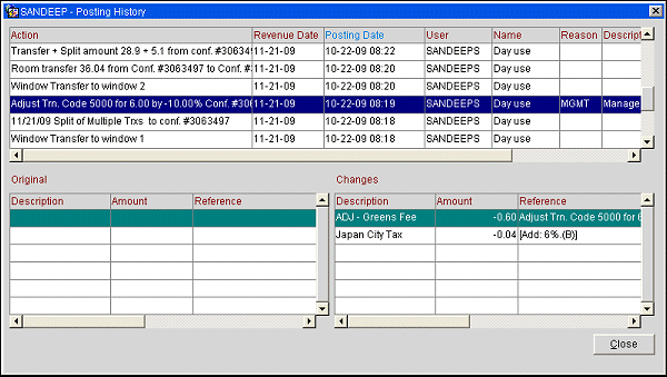 Example 4 - If there has been an adjustment to the posting: The Action entry shows the original charge and the adjustment. There is no Original entry, only a Changes entry because, internally, the adjustment is an entirely new (negative) posting.