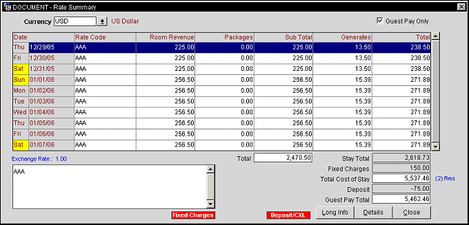 The screen shows the following information for each day of the guest's stay. (Highlight the entry for a particular date and select the Details button to see a breakdown of the summary information. See Rate Details, below. )