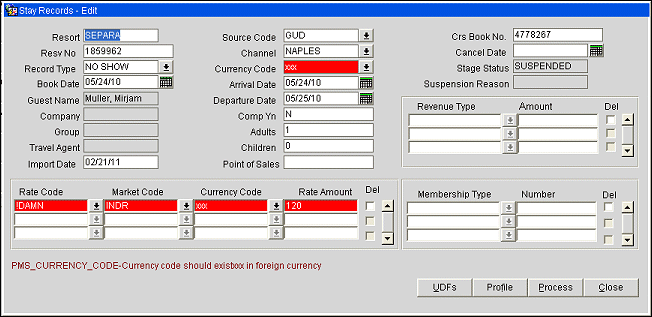 The Stay Suspension screen shows records that were rejected by OPERA. For example, a record might not be processed because the check in date is after the booking date. This screen also gives you access to the errors that occurred when processing records. Once you resolve the causes of the errors, you can resubmit the record directly from this screen by selecting Reprocess.