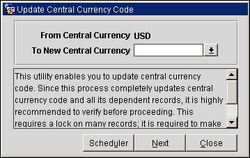Information Field. This utility enables you to update central currency code. Since this process completely updates central currency code and all its dependent records, it is highly recommended to verify before proceeding. This requires a lock on many records; it is required to make sure that users are logged off during the process.